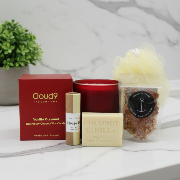 Dive into pure bliss with the Vanilla Dreaming Gift Box. This gift box bundles together everything they need to unwind: a dreamy vanilla candle to set the vibe, a silky lip balm for kissable softness, a luxe salt soak to soak away stress, a creamy soap bar and a fluffy shower puff for extra pampering. Sweet dreams start here!