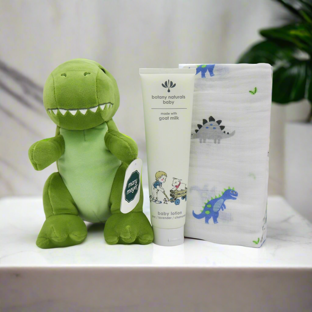 This dino-mite gift box packs in a prehistoric punch with its tot-tastic dinosaur toy, gentle baby lotion and soft premium muslin wrap.