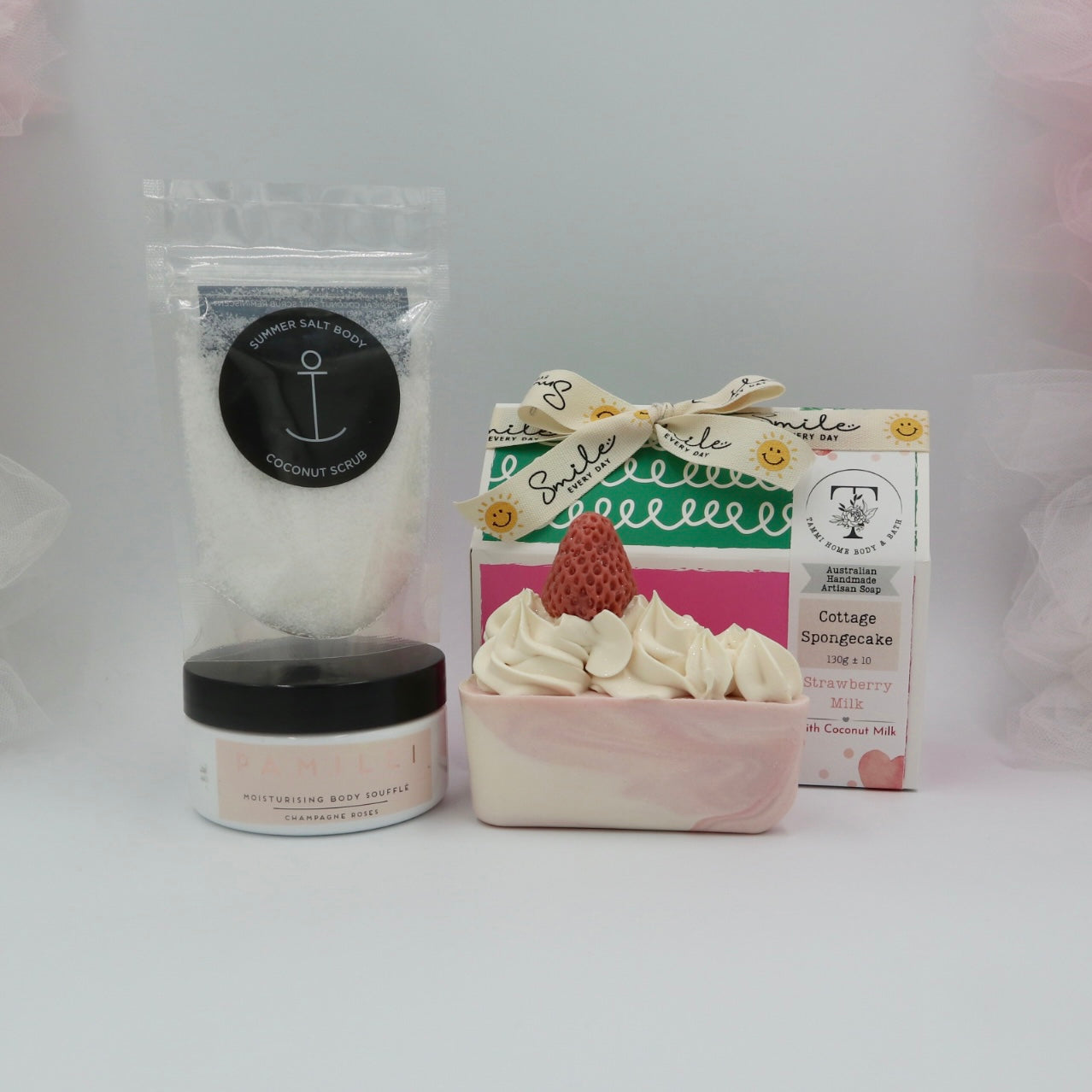 Delight in its Strawberry Milk fragrance infused with coconut milk, a creamy, sweet scent that transports you to cozy, sunlit afternoons. Provides a gentle, nourishing experience suitable for all skin types. Weight: Approx. 120g. Dimensions: 10 x 7 x 10cm. Made in Australia.